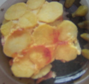 Syrové brambory nakrájíme na tenká kolečka,oloupanou cibuli na plátky,slaninu a sýr na kostičky.