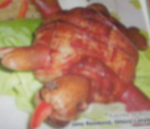 Anglickou slaninu si nakrájíme na proužky,které skládáme jako mřížku a klademe na tělíčka.Konce zasuneme dospod a přitlačíme.